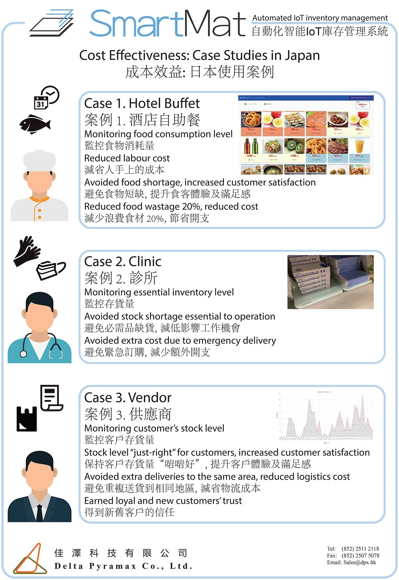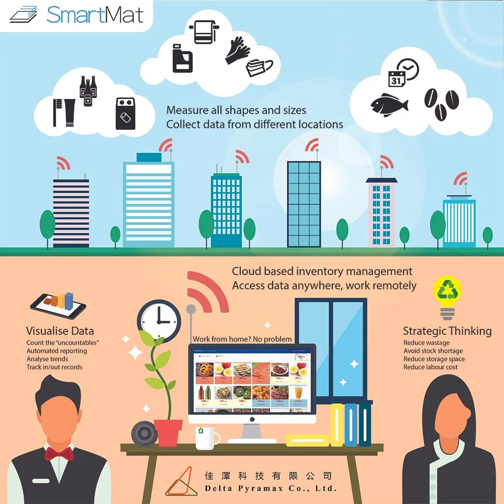 Count the uncountable, remote inventory management from solid to contained liquid and gas. Smart Mat helps you collect big data, plan your sourcing schedule and waste collection plan to reduce wastes and resources. Learn behaviours, and optimize your business operation accordingly.